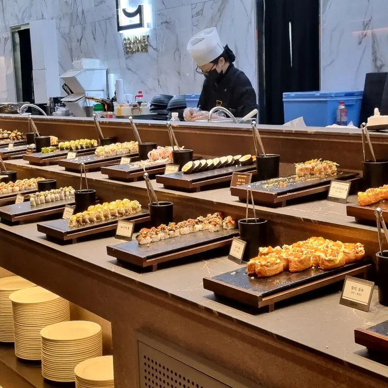 자리를 잡고 뷔페를 한 바퀴 쭉 둘러봤는데, 이야… 입이 떡 벌어질 정도로 음식 종류가 어마어마하더라고. 초밥, 롤 종류만 해도 몇십 가지는 되어 보이는 게, 뭘 먼저 먹어야 할지 행복한 고민에 빠졌지. 싱싱한 생선회는 윤기가 좌르르 흐르는 게, 보기만 해도 군침이 꼴깍 넘어갔어.