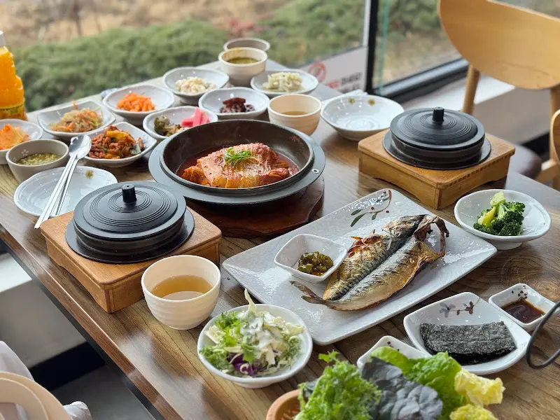 드디어 기다리고 기다리던 음식이 나왔어. 이야, 상이 꽉 차도록 푸짐하게 차려진 거 있지. 묵은지 고등어 쌈밥은 뚝배기에 묵은지가 통째로 들어가 있고, 그 아래에는 고등어가 숨어 있더이다. 전복 돌솥밥은 김이 모락모락 나는 게, 냄새부터가 아주 향긋했어.