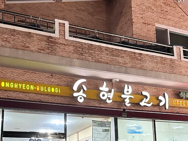 가게 앞에 딱 도착하니, 어릴 적 골목 어귀에서 풍겨오던 그 연탄불 냄새가 확 풍겨오는 거 있지. 아이고, 그때 그 시절에는 집집마다 연탄불 피워 밥 짓고, 저녁에는 옹기종기 모여 앉아 고구마도 구워 먹고 그랬는데… 세월 참 빠르다 싶어. 가게 간판이 눈에 확 들어오는데, 정겨운 글씨체로 “송현불고기”라고 쓰여 있더라고. 노란색 배경에 흰색 글씨가 왠지 모르게 따뜻하게 느껴졌어.