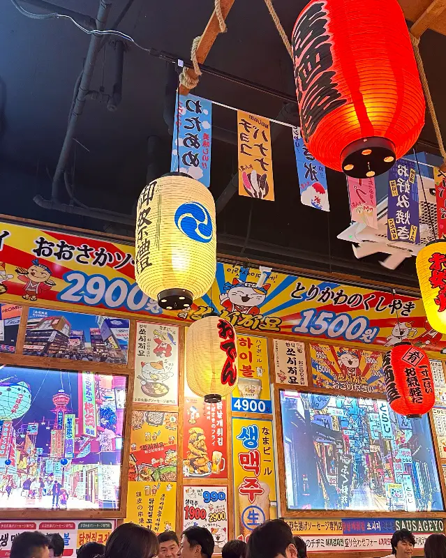 가게 문을 열고 들어서는 순간, 일본 분위기가 물씬 풍기는 인테리어에 눈이 휘둥그레졌어. 천장에 매달린 빨간색, 노란색 등들이 따뜻하게 비추고, 벽에는 일본어로 쓰인 포스터와 그림들이 가득 붙어 있었어. 테이블은 드럼통을 개조해서 만든 것 같았는데, 은근히 분위기 있더라? 이런 힙한 분위기 너무 좋아!