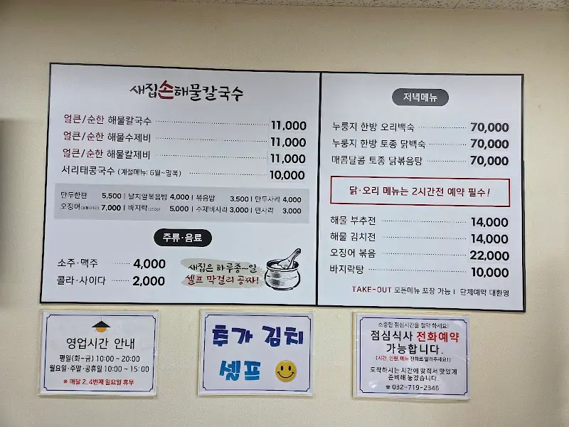 나오는 길에 보니, 식당 입구에 커다란 배너가 세워져 있더라고. “새집손해물칼국수”라고 큼지막하게 쓰여 있고, “시원한~ 해물칼국수”라고 적혀 있는데, 어찌나 정겹던지.