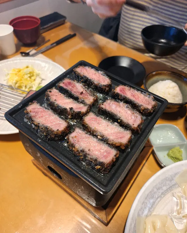 드디어 기다리고 기다리던 규카츠가 나왔어. 겉은 바삭하고 속은 촉촉한 육즙이 살아있는 규카츠의 자태에 감탄이 절로 나왔어. 뜨겁게 달궈진 작은 화로 위에 규카츠를 한 점 올려놓으니, 치이익- 하는 소리와 함께 맛있는 냄새가 코를 찔렀어. 아이고, 이 맛있는 냄새는 정말 참기 힘들다니까!