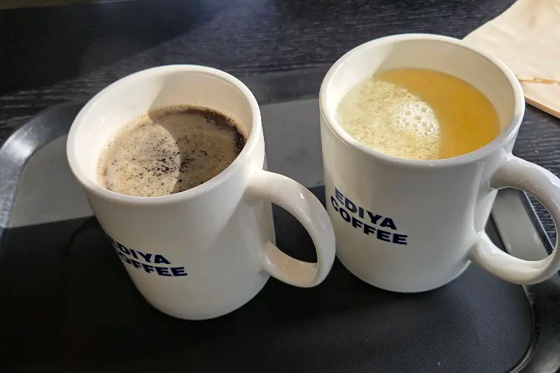따뜻한 아메리카노와 유자차. 이디야 커피 특유의 머그컵이 정겹다.
