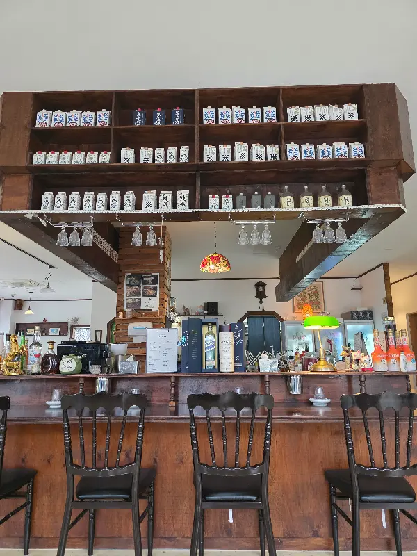 이자카야 시오의 다찌석과 술병이 진열된 모습
