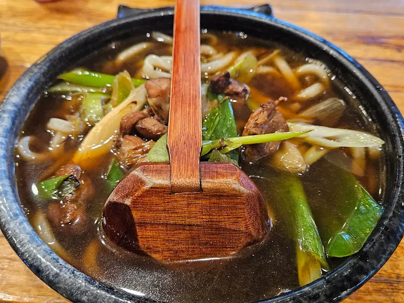 드디어 닭고기 우동이 테이블에 놓였다. 뚝배기 안에서 김이 모락모락 피어오르는 모습은 시각적인 만족감을 극대화했다. 진한 갈색 육수 위로 닭고기, 대파, 유부 등이 넉넉하게 올려져 있었다. 마치 잘 설계된 분자 모형처럼, 각 재료는 완벽한 조화를 이루고 있었다. 나무로 만든 묵직한 국자 또한 인상적이었다.