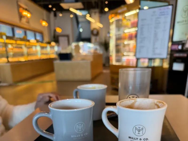 카페 내부는 꽤 넓었고, 테이블 간 간격도 넓어서 편안하게 대화를 나눌 수 있었다. 1층에는 편안한 소파 좌석도 마련되어 있었고, 2층 루프탑은 탁 트인 전망을 자랑했다. 특히 통유리창을 통해 들어오는 햇살이 공간을 따뜻하게 감싸 안아주는 느낌이 좋았다. 어떤 사람들은 노트북을 들고 와 조용히 작업을 하기도 하고, 어떤 사람들은 친구들과 함께 웃음꽃을 피우기도 했다. 밀리앤코는 누구에게나 열려 있는, 편안하고 아늑한 공간이었다.