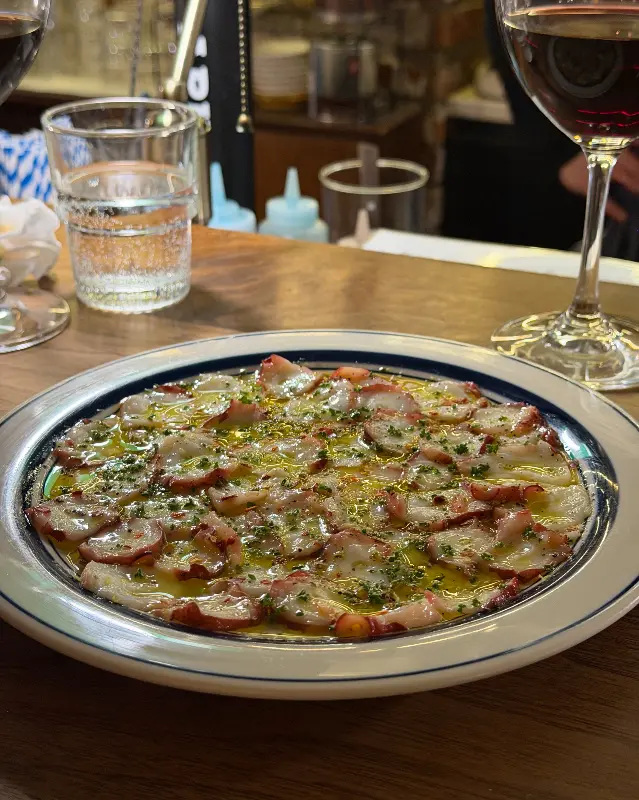 가장 먼저 등장한 것은 뽈뽀맘보였다. 접시 위에 펼쳐진 얇게 슬라이스 된 문어는 마치 꽃잎 같았다. 그 위에는 초록색 허브가 흩뿌려져 있어 싱그러움을 더했다. 한 입 맛보니, 쫄깃하면서도 부드러운 문어의 식감이 입안 가득 퍼져 나갔다. 스파이시한 소스는 자칫 느끼할 수 있는 맛을 잡아주었고, 포슬포슬한 감자는 문어와 환상적인 조화를 이루었다. 특히 소스가 인상적이었는데, 살짝 매콤하면서도 감칠맛이 느껴지는 것이, 도대체 비법이 뭘까 궁금해졌다. 샐러드도 함께 나왔는데, 채소가 어찌나 신선한지, 입안 가득 싱그러움이 퍼져 나갔다. 고소한 치즈는 샐러드의 풍미를 한층 끌어올려 줬다.