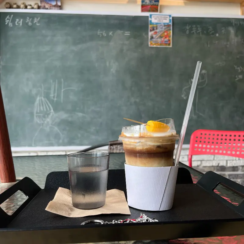 드디어 옥수수 라떼가 내 앞에 놓였다. 을 보면 알 수 있듯이, 옥수수 라떼는 단순한 음료가 아닌, 과학적 호기심을 자극하는 실험 도구처럼 보였다. 컵 위에는 앙증맞은 옥수수 젤리가 꽂혀 있었고, 라떼의 표면은 마치 크림 브륄레처럼 매끄럽고 윤기가 흘렀다.