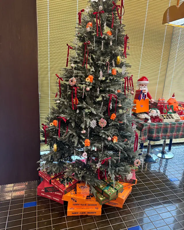 매장 문을 열자마자 눈 앞에 펼쳐진 건… 와, 진짜 딴 세상이었다. 통유리창으로 쏟아지는 햇살 덕분에 매장 안이 완전 따뜻하고 아늑한 분위기! 거기에 주황색 포인트 컬러가 더해지니까 진짜 힙한 느낌 뿜뿜! 밖은 엄청 추웠는데, 여기 들어오니까 몸도 마음도 사르르 녹는 기분이었다. 크리스마스 시즌이라 그런지 커다란 트리 장식도 되어있었는데, 도넛 박스들이 트리 밑에 쌓여있는 게 진짜 센스 넘치더라. 사진을 안 찍을 수가 없었음!