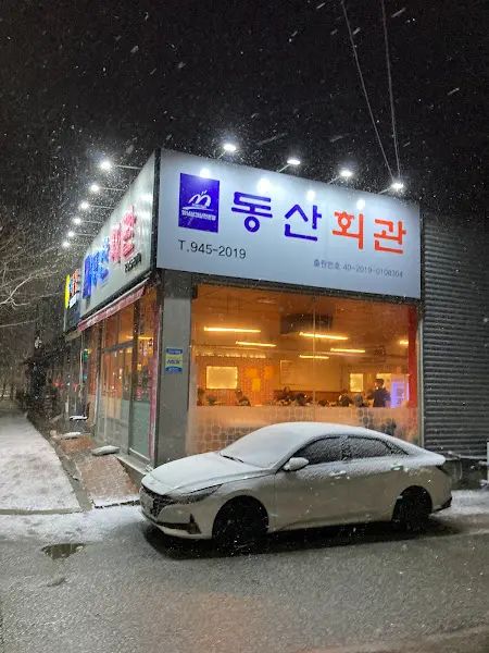 차를 몰고 슝슝 달려 도착한 동산회관! 멀리서부터 보이는 간판부터가 뭔가 범상치 않은 기운을 뿜어낸다. 겉에서 보기엔 평범한 식당 같지만, 이미 내 맘속 기대치는 하늘을 뚫고 날아가는 중! 주차는 가게 앞에 몇 대 댈 수 있는 공간이 있어서 다행히 편하게 주차했다. 눈이 소복하게 쌓인 풍경이 왠지 더 운치 있게 느껴지는 건 기분 탓일까?