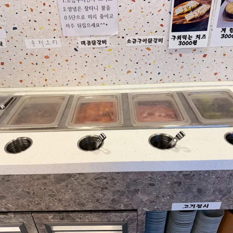 자리에 앉자마자 직원분께서 친절하게 이용 방법을 설명해주셨다. 이곳은 무한리필 시스템으로 운영되고 있었는데, 닭갈비 종류도 다양하고, 샐러드바도 풍성하게 준비되어 있어 가격 대비 만족도가 높다는 인상을 받았다. 특히, 국내산 생닭만을 사용한다는 점이 믿음직스러웠다. 무한리필이라고 해서 질이 떨어지는 고기를 사용하는 곳도 많은데, 이곳은 재료에 대한 자부심이 느껴졌다.