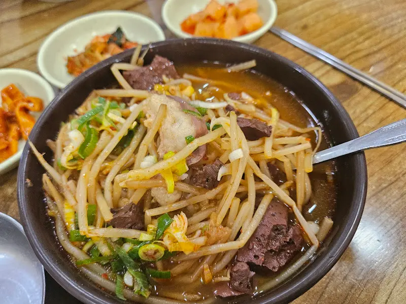 메뉴판을 살펴보니 해장국, 선지국밥, 비빔밥 등 다양한 메뉴가 있었다. 가격도 대체로 저렴한 편이었다. 특히 선지국밥이 맛있다는 평이 많아, 나도 선지국밥을 주문했다. 6,000원이라는 가격이 믿기지 않을 정도로 푸짐한 양이었다. 잠시 후, 김이 모락모락 나는 선지국밥이 내 앞에 놓였다. 뚝배기 안에는 선지와 콩나물, 우거지 등이 가득 들어 있었다. 국물은 보기만 해도 얼큰해 보였다.