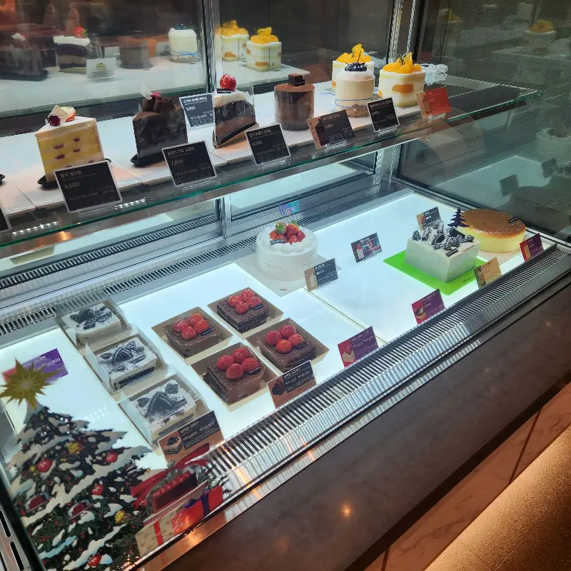자리를 잡기 위해 카페 내부를 천천히 둘러봤다. 노란빛 조명이 공간을 감싸 안고, 아늑한 분위기를 자아낸다. 창밖으로는 다사역 광장의 야경이 한눈에 들어온다. 형형색색의 조명이 반짝이는 모습은 마치 작은 별들이 춤을 추는 듯 아름다웠다. 카페 곳곳에는 아기자기한 소품들이 놓여 있어, 공간에 생기를 불어넣고 있었다. 특히 눈길을 사로잡았던 것은, 쇼케이스 안에 진열된 형형색색의 케이크들이었다. 마치 보석처럼 빛나는 케이크들은, 보는 것만으로도 기분을 좋게 만들었다.