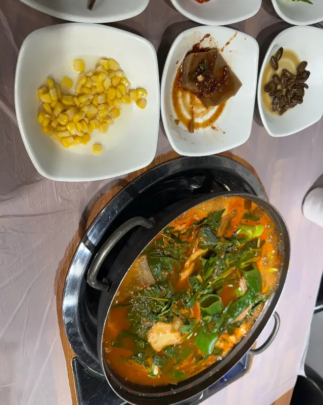 송어회를 거의 다 먹어갈 때쯤, 쏘가리 매운탕이 테이블 위에 놓였다. 뚝배기 안에서 보글보글 끓고 있는 매운탕은 보기만 해도 군침이 돌았다. 깻잎과 방아잎이 듬뿍 들어간 매운탕에서는 향긋한 향이 코를 자극했다. 국물을 한 숟가락 떠서 맛보니, 시원하면서도 칼칼한 맛이 정말 일품이었다. 쏘가리 특유의 담백한 맛과 채소의 시원함이 어우러져, 깊고 풍부한 맛을 냈다.