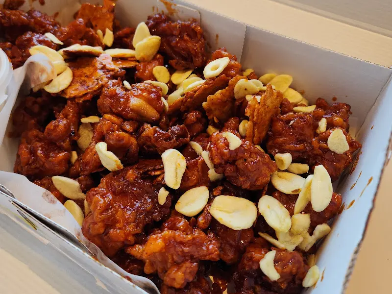 드디어 내 번호가 불리고, 따뜻한 온기가 느껴지는 닭강정 상자를 받아 들었다. 뚜껑을 여는 순간, 달콤하면서도 쌉싸름한 흑마늘 향이 코끝을 간지럽혔다. 짙은 갈색 양념을 입은 닭강정 위로 바삭한 누룽지와 마늘칩이 흩뿌려져 있는 모습은, 그야말로 군침이 절로 도는 비주얼이었다.