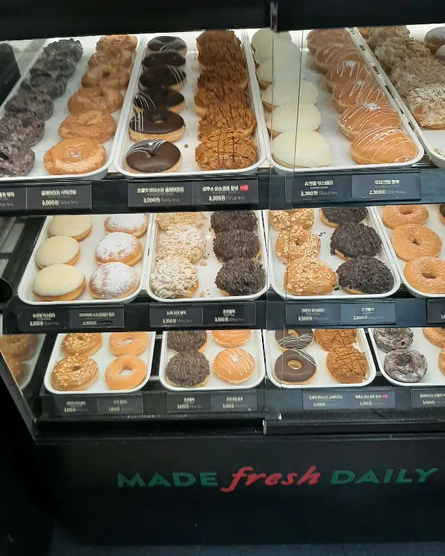 모란역, 그 번잡한 풍경 속에 감춰진 작은 보석 같은 공간이 있다. 크리스피 크림 도넛. 그곳으로 향하는 발걸음은 언제나 설렘으로 가득 찬다. 오늘은 어떤 달콤한 마법이 나를 기다리고 있을까? 문을 열고 들어서는 순간, 달콤한 향기가 코끝을 간지럽히며 어린 시절의 향수를 불러일으킨다. 쇼케이스 안에는 형형색색의 도넛들이 마치 보석처럼 진열되어 있었다.