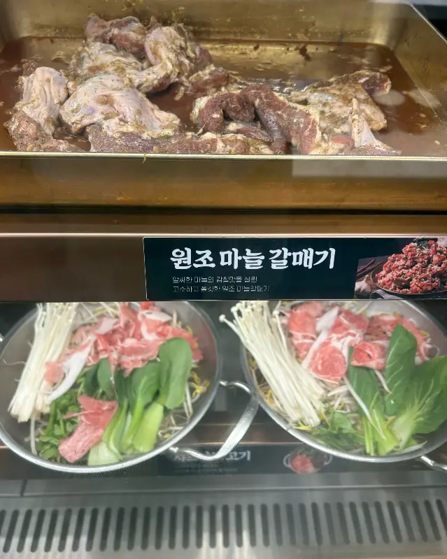 다진 마늘 양념이 듬뿍 올려진 갈매기살, 불판에 올리니 마늘 향이 코를 자극해.
