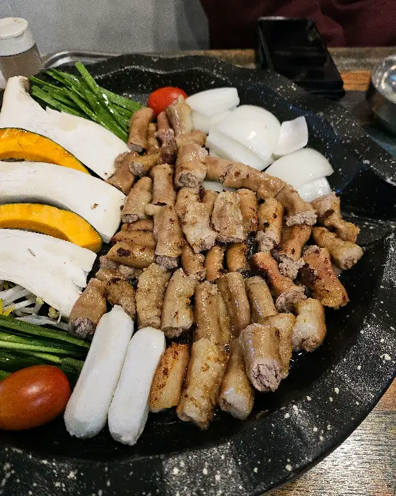 이윽고 등장한 오늘의 주인공, 곱창 모듬 구이가 그 자태를 드러냈습니다. 숯불 위에 올려진 둥근 솥뚜껑 위에는 신선한 한우 곱창, 대창, 그리고 염통이 먹음직스럽게 펼쳐져 있었습니다. 겉보기에도 신선함이 가득 느껴지는 곱창은 굵직한 곱이 꽉 차 있어 보는 것만으로도 군침이 돌았습니다. 곁들여진 단호박, 버섯, 양파, 그리고 파릇한 채소들은 풍성한 비주얼을 더하며 맛의 조화를 예고했습니다.
