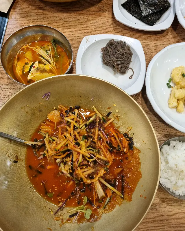 주문을 마치자, 밑반찬들이 하나둘씩 테이블 위를 채웠다. 놋그릇에 담겨 나온 반찬들은 시각적인 만족감을 높여주었고, 정갈함은 음식에 대한 기대감을 증폭시켰다. 특히 눈에 띄는 것은 코다리 튀김였다. 겉은 바삭하고 속은 촉촉한, 이상적인 튀김의 질감을 구현해냈다. 튀김옷의 바삭함은 전분 입자가 기름과 만나 급격하게 수분을 잃으면서 형성된 마이야르 반응의 결과물일 것이다.
