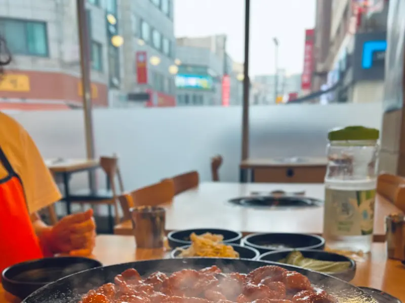 비주얼 진짜 미쳤다… 빨간 양념에 윤기 좔좔 흐르는 쭈꾸미가 철판 가득 담겨 나오는데, 사진 안 찍을 수가 없더라. 직원분께서 직접 구워주시는데, 1분만 더 익히면 된다고 친절하게 설명해주셨다.