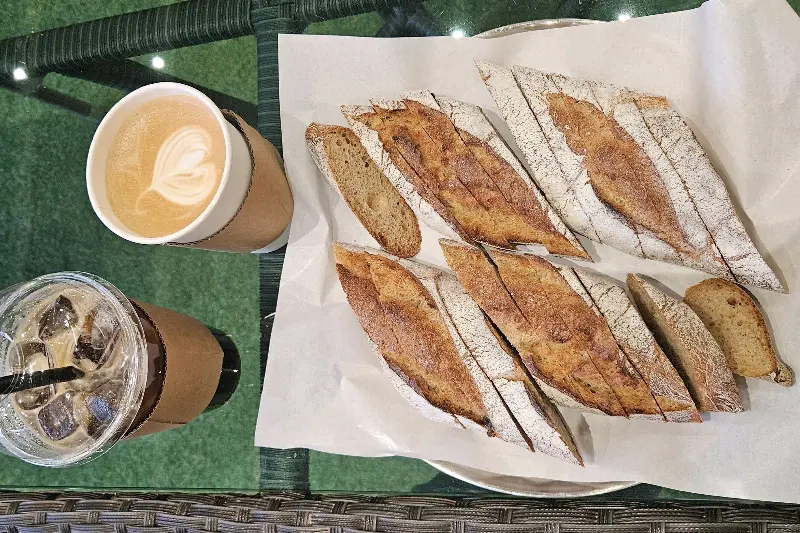 테이블 위에 놓인 커피와 소금빵