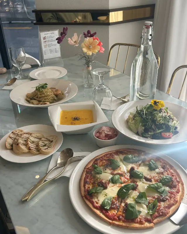 곧이어, 그린 샐러드가 나왔다. 싱싱한 로메인, 토마토, 블랙 올리브, 크루통 등이 조화롭게 어우러진 모습은 보기만 해도 건강해지는 기분이었다. 샐러드 위에는 파르미지아노 레지아노 치즈가 넉넉하게 뿌려져 있어, 풍미를 더했다. 입안 가득 퍼지는 신선한 채소의 아삭함과 고소한 치즈의 풍미는 완벽한 조화를 이루었다. 특히, 샐러드 드레싱은 자극적이지 않고 은은한 허브 향이 느껴져, 재료 본연의 맛을 해치지 않으면서도 샐러드의 풍미를 한층 끌어올렸다.