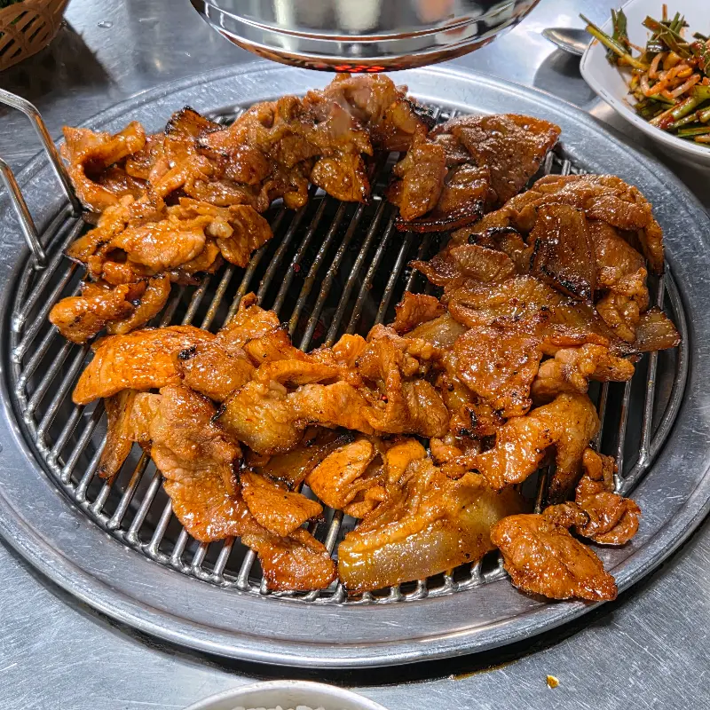 함께 제공되는 밑반찬들도 하나하나 정성이 느껴진다. 갓 담근 듯 신선한 배추김치와 깍두기는 적당히 익어 고기와 함께 먹으니 입맛을 돋우고, 특히 부추 콩나물 무침은 매콤하면서도 아삭한 식감이 훌륭해 고추장구이와 쌈 싸 먹으면 최고의 궁합을 자랑한다.
