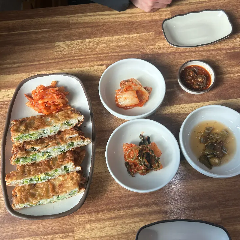 드디어 기다리고 기다리던 파전 등장! 비주얼부터가 장난 아니더라. 큼지막한 파가 듬뿍 들어가 있고, 겉은 완전 바삭바삭해 보이는 게 딱 내 스타일. 젓가락으로 찢어 먹는데, 겉은 진짜 파삭! 소리가 날 정도로 바삭하고, 속은 촉촉한 게 진짜 예술이야. 파의 향긋한 향이랑 튀김옷의 고소함이 입안에서 막 폭발하는 느낌? 간장에 콕 찍어 먹으니 진짜 꿀맛이더라. 솔직히 파전 별로 안 좋아하는 사람도 여기 파전은 무조건 좋아할 거라고 장담할 수 있어. 약간 빈대떡과 파튀김의 중간 어디쯤 있는 느낌이랄까? 완전 독특하고 맛있어.
