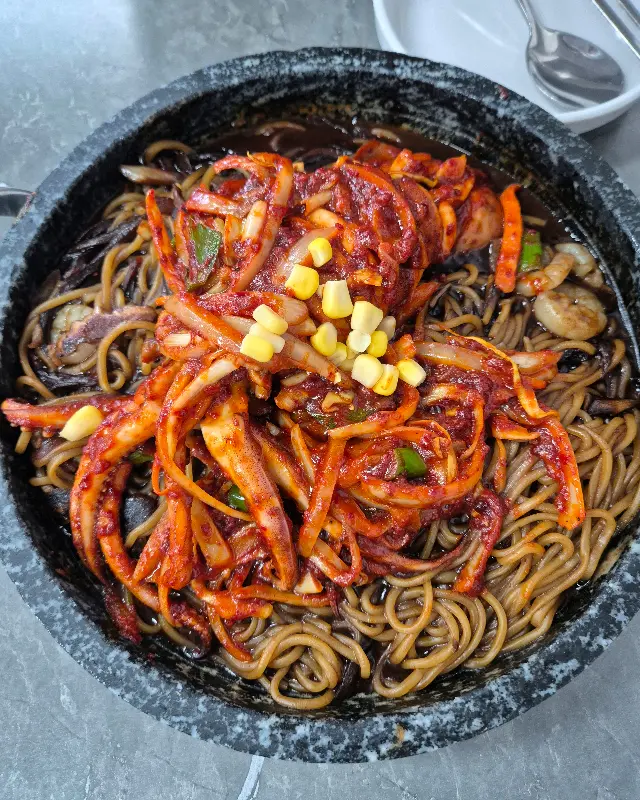 드디어 기다리고 기다리던 돌짜장이 나왔어. 뜨겁게 달궈진 돌판 위에서 짜장면이 지글지글 끓고, 그 위에는 통통한 오징어 한 마리가 통째로 올라가 있는 모습이 정말 장관이었어. 매콤한 양념 냄새가 코를 찌르는 게, 군침이 절로 돌더라.