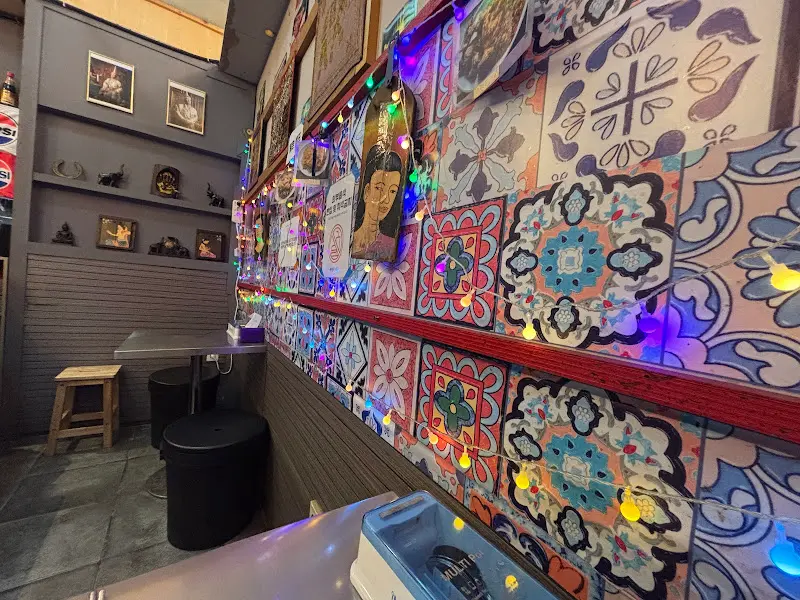 알록달록한 타일과 태국 장식품이 가득한 써이포차나 내부