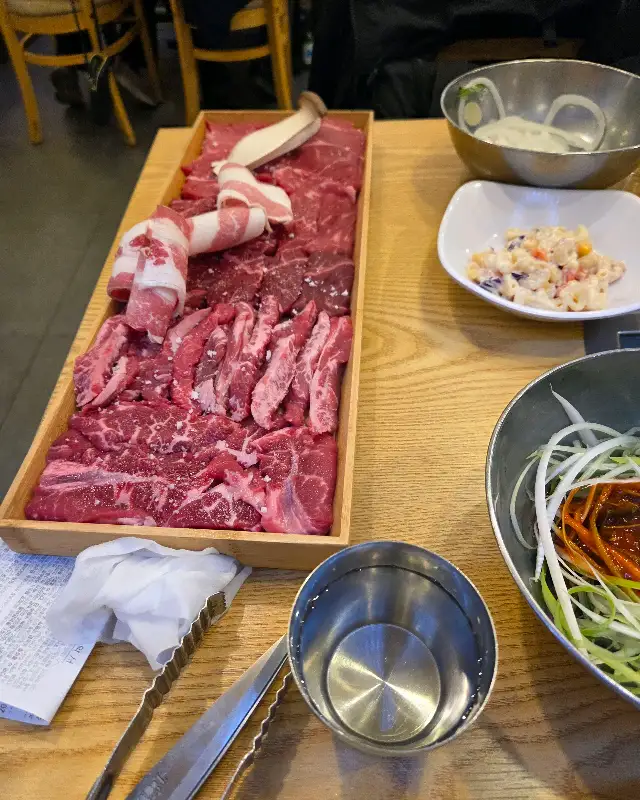 이곳의 가장 큰 매력은 메뉴 구성의 직관성과 가성비입니다. 큰 소 한 마리(1.2kg, 79,000원)와 작은 소 한 마리(64,000원)라는 명확한 메뉴판은 선택 장애를 겪는 손님들에게 구세주와 같습니다. 제가 주문한 메뉴는 작은 소 한 마리였는데, 테이블에 서빙된 고기의 때깔을 보는 순간 이곳이 왜 인기가 많은지 단번에 납득할 수 있었습니다. 정육식당답게 신선도가 남다른 육질은 물론이고, 부위별로 넉넉하게 담겨 나와 골라 먹는 재미가 쏠쏠했습니다.