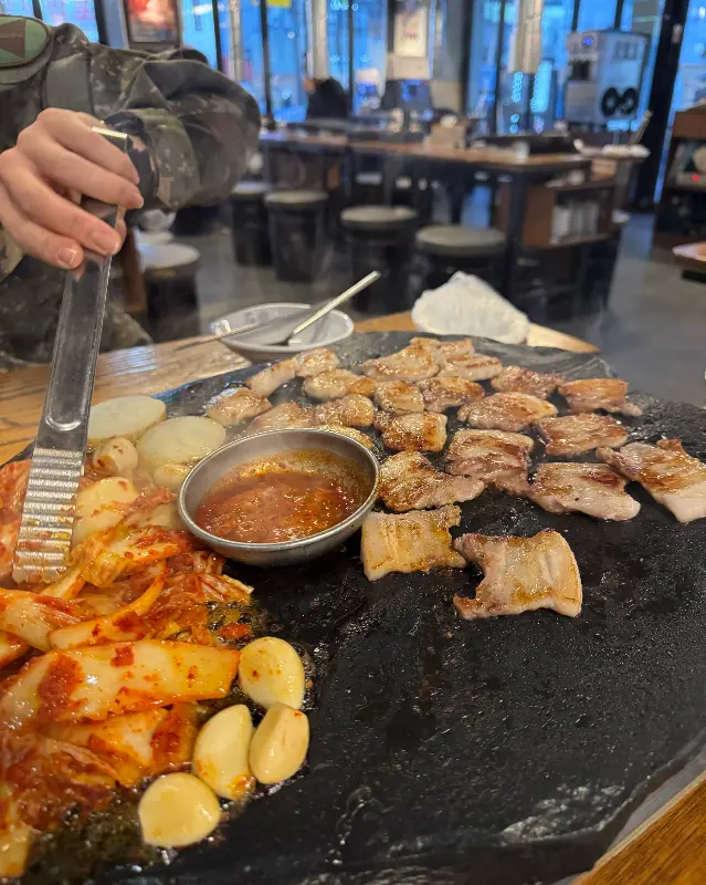 고소한 육즙이 입안 가득 퍼지고, 쫄깃한 식감이 어우러져 정말 꿀맛이었어. 특히, 돌판에 구운 김치랑 같이 먹으니 느끼함도 싹 가시고, 정말 환상의 궁합이 따로 없더라고.