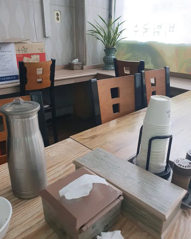 가게 문을 열고 들어서자, 정겨운 분위기가 확 풍겨온다. 테이블은 나무 재질로 되어있고, 의자 등받이에는 네모난 구멍이 뚫려있는, 딱 봐도 오래된 맛집 느낌! 어릴 적 할머니 집에서 보던 듯한 친근한 풍경에 마음이 푸근해졌다. 테이블 위에는 스테인리스 물통과 냅킨, 종이컵이 가지런히 놓여있었다. 딱 봐도 깔끔하게 정돈된 느낌이랄까.