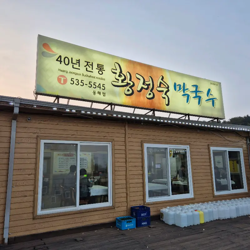 강원도 동해, 바다 내음 가득한 이 곳에 40년 전통의 막국수 맛집이 있다는 소문을 익히 들어 알고 있었지. 이름하여 ‘황정숙 막국수’. 래퍼로서의 직감을 발휘, 이건 무조건 가야 한다고 판단! 네비 on 하고 바로 출발했다. 간판부터 범상치 않아. 40년 내공이 느껴지는 포스, 마치 전설의 래퍼를 영접하는 기분이랄까? 이름 석 자, 황정숙, 왠지 모르게 친근한 느낌.