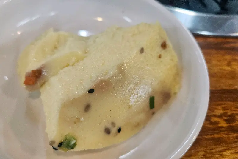 밑반찬들을 하나하나 분석하기 시작했다. 먼저 눈에 띈 것은 부드러운 계란찜이었다. 마치 푸딩 같은 질감은 입 안에서 사르르 녹아내렸다. 계란의 단백질이 열에 의해 응고되면서 만들어진 섬세한 망상 구조는, 입 안 가득 부드러움을 선사했다. 흑임자가 콕콕 박혀 있어 고소한 풍미까지 더했다.