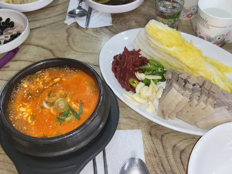 주문하고 얼마 지나지 않아 밑반찬들이 쫙 깔리기 시작했는데, 와… 이거 완전 혜자스럽다! 콩비지찌개는 기본으로 나오는데, 어찌나 고소하고 맛있는지 메인 메뉴 나오기 전에 이미 밥 한 공기 뚝딱 해치울 뻔했다. 콩비지 특유의 부드러움과 고소함이 입안 가득 퍼지는데, 진짜 이 콩비지찌개 하나만으로도 밥도둑 인정이다.
