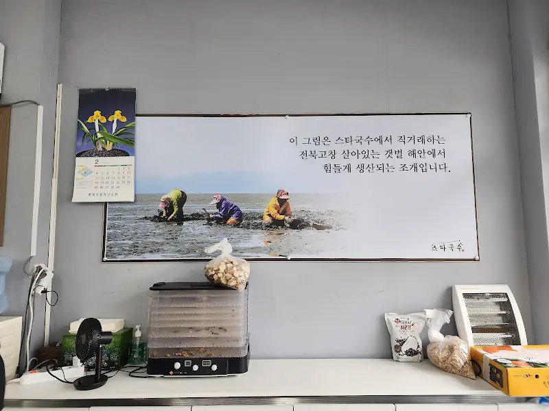 주문 후 잠시 기다리는 동안, 가게 안을 둘러보았다. 벽 한쪽에는 바다를 배경으로 해녀들이 조개를 채취하는 사진이 걸려 있었다. 그 사진 아래에는 “이 그림은 스타 칼국수에서 정직하게 길러내는 홤목정 청정해역에서 힘겹게 생산되는 조개입니다”라는 문구가 적혀 있었다. 싱싱한 조개를 사용한다는 자부심이 느껴지는 문구였다.