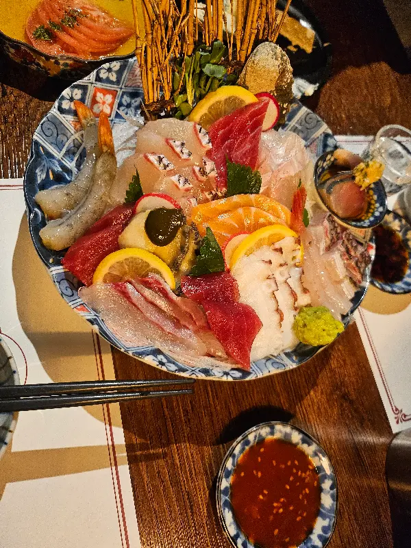 잠시 후, 기다리고 기다리던 모듬 사시미가 등장했다. 푸른 빛깔의 접시 위에 놓인 사시미는 마치 한 폭의 그림 같았다. 도톰하게 썰린 참치, 연어, 광어, 숭어, 그리고 신선한 해삼과 새우까지. 다채로운 색감과 싱싱한 비주얼은 감탄을 자아내기에 충분했다. 윤기가 자르르 흐르는 사시미 한 점을 조심스레 집어 들었다. 젓가락 끝에서 느껴지는 묵직함은 신선함을 그대로 전달해주는 듯했다.