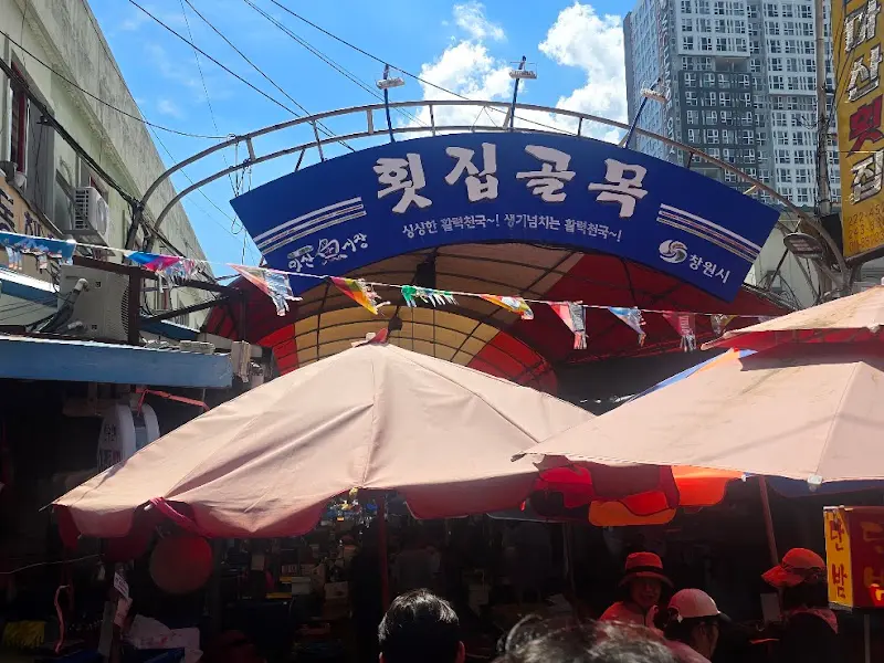 대구에서 한 시간 남짓 달려 도착한 마산 어시장. 와, 입구부터 스케일이 장난 아니더라. 쫙 뻗은 도로 양옆으로 늘어선 가게들, 그 위를 덮은 아치형 지붕하며, 알록달록 깃발들이 펄럭이는 모습이 축제 분위기를 제대로 자아내고 있었어. 마치 다른 세계로 통하는 문을 들어서는 기분이랄까? 이미지에서도 볼 수 있듯이, ‘횟집골목’이라는 파란 간판이 딱! 박혀있는 곳을 찾았는데, 여기가 바로 현지인들이 입을 모아 추천하는 그 복 거리 초입인 것 같더라고. 기대감 MAX!