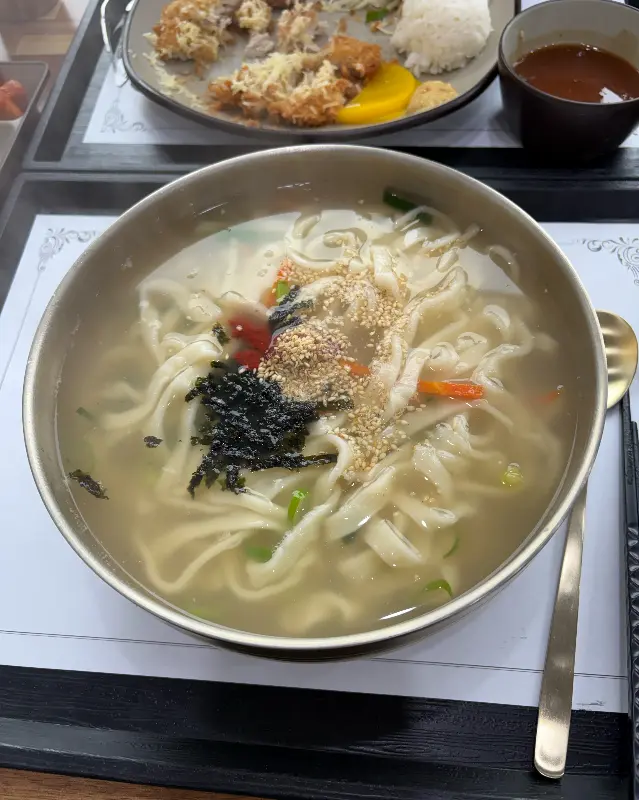 가장 먼저 눈에 들어온 것은 손칼국수였다. 뽀얀 국물 위로 김 가루와 깨가 넉넉하게 뿌려져 있었고, 면발 사이사이로 호박, 당근 등 알록달록한 채소가 숨어 있었다. 뜨거운 김이 모락모락 피어오르는 모습은, 마치 어머니가 정성껏 끓여주시던 칼국수를 연상시켰다.