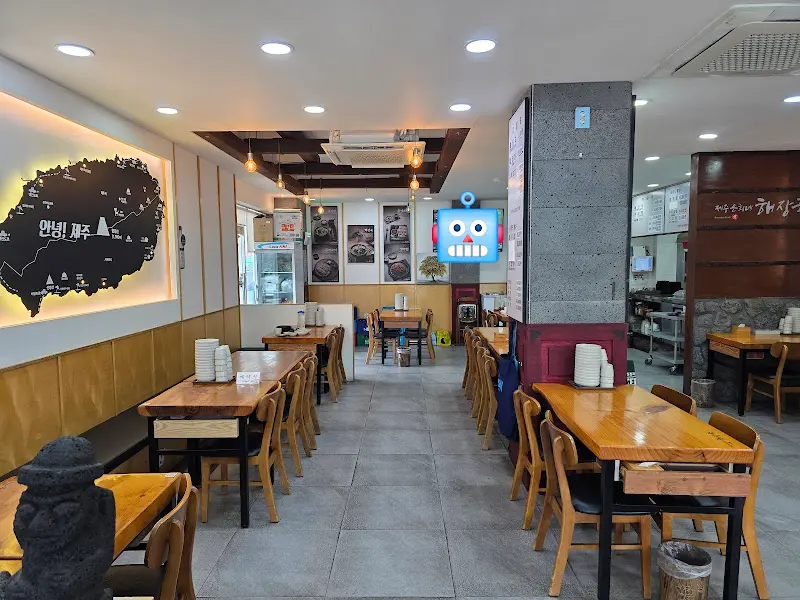 문을 열고 들어서니, 넓고 깔끔한 실내가 한눈에 들어왔다. 나무 테이블과 의자가 정갈하게 배치되어 있었고, 벽면에는 제주도의 풍경 사진과 지도가 걸려 있어 마치 제주도에 온 듯한 느낌을 자아냈다. 혼자 방문했음에도 전혀 어색함 없이 자리를 잡을 수 있었다.