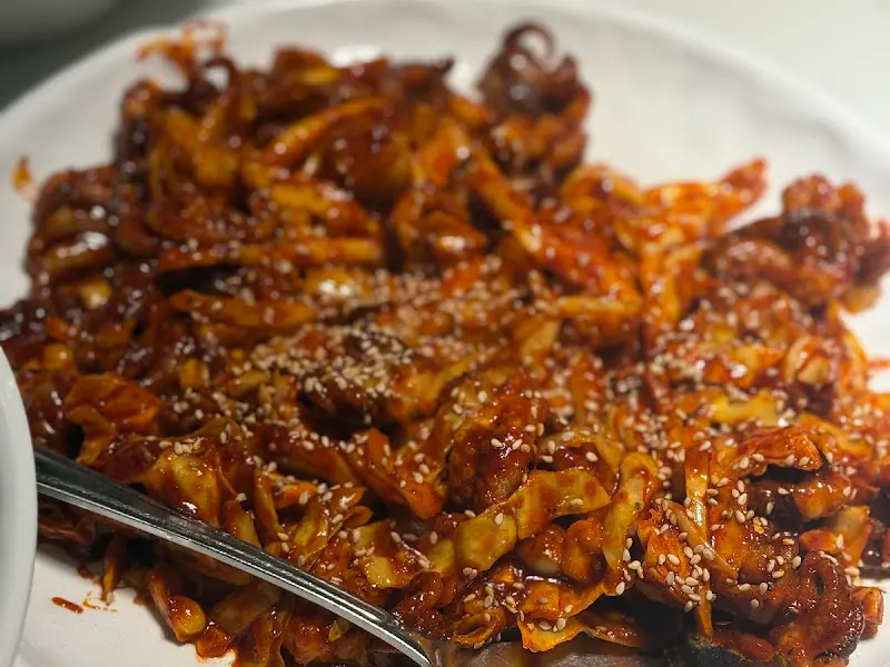 드디어 쭈꾸미 칼국수 정식을 맛볼 시간! 먼저 쭈꾸미 볶음을 한 입 먹어보니, 화끈한 매운맛이 입안 가득 퍼졌다. 캡사이신의 인위적인 매운맛이 아니라, 고춧가루와 다양한 양념에서 우러나오는 자연스러운 매운맛이라 더욱 좋았다. 쭈꾸미는 질기지 않고 쫄깃쫄깃한 식감을 자랑했다. 양념도 과하지 않고 적당해서 쭈꾸미 본연의 맛을 잘 살려주는 듯했다. 매운 음식을 잘 못 먹는 사람들에게는 조금 맵게 느껴질 수도 있겠지만, 매운맛을 좋아하는 사람들에게는 최고의 선택이 될 것이다. 사진에서 보이는 쭈꾸미의 윤기만 봐도 그 맛을 짐작할 수 있을 것이다.