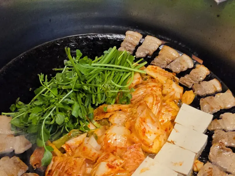 드디어 무쇠판 등장! 진짜 컸어. 묵직한 무쇠판 위에 김치랑 삼겹살, 콩나물, 미나리, 두부, 마늘까지 한가득 올려주는데, 와… 진짜 침샘 폭발하는 비주얼. 특히 김치! 딱 봐도 푹 익은 게, 완전 내 스타일이더라. 직원분이 능숙한 솜씨로 고기를 구워주시는데, 기름은 쏙 빠지고 육즙은 그대로 살아있는, 딱 그런 비주얼이었어.