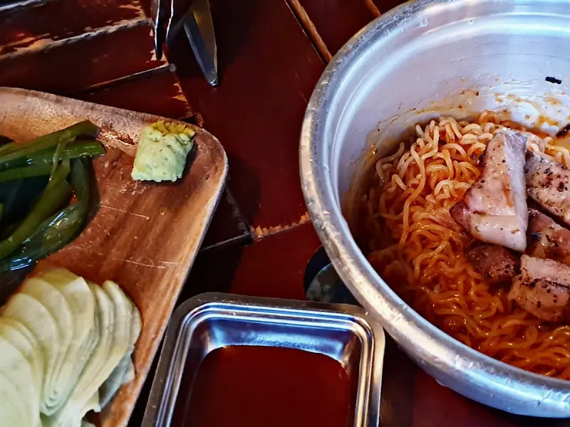 특히 훈제 통삼겹은 겉은 바삭하고 속은 촉촉해서 식감이 진짜 좋았어. 채끝살 소고기도 어찌나 부드럽던지! 파인애플이랑 같이 먹으니까 상큼하면서 달콤한 맛이 더해져서 완전 꿀조합이더라. 숙주볶음도 아삭아삭하니 고기랑 너무 잘 어울리고, 마늘이랑 청양고추는 느끼함을 잡아줘서 계속 흡입하게 되는 맛이었어.