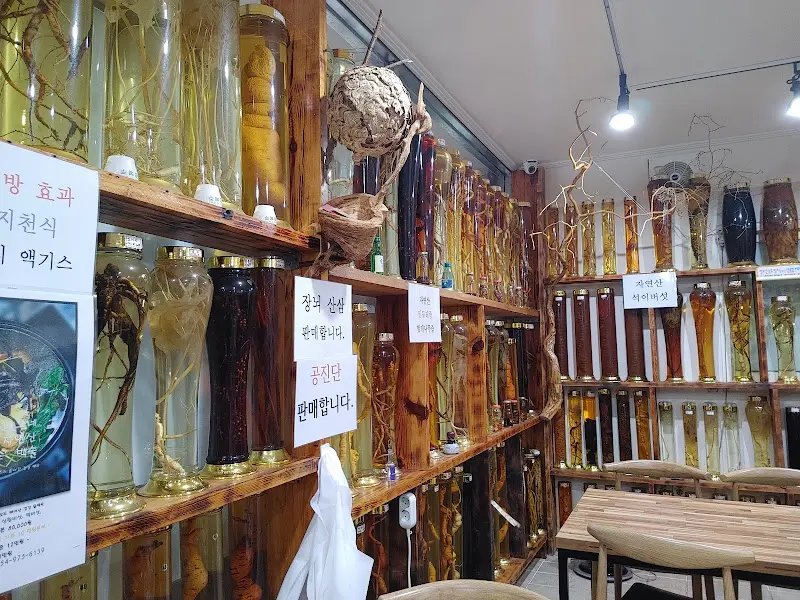 가게 안으로 들어서자마자 눈에 띈 건, 각종 담금주들이었다. 그것도 그냥 담금주가 아니라, 귀한 약초들로 담근 술들이 쫙 진열되어 있는데, 진짜 압도적인 비주얼이었다. 뭔가, ‘제대로 찾아왔구나’ 하는 느낌이 팍 왔다. 향긋한 약초 향이 코를 찌르는데, 벌써부터 몸이 건강해지는 기분! 사진에서 봤던 것보다 훨씬 웅장하고 멋있었다. 마치 박물관에 온 듯한 느낌도 들고.