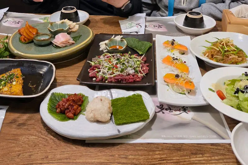 * : 여러 가지 음식들이 한 상 가득 차려진 모습. 육회, 생선, 샐러드 등 다양한 메뉴가 보인다. 전체적으로 음식이 신선하고 맛있어 보인다.