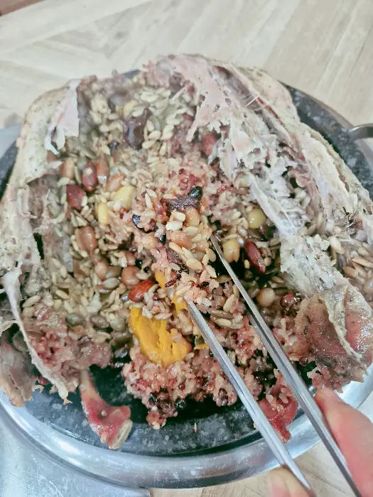이게 끝이 아니죠! 오리 뱃속을 채우고 있던 찹쌀밥과 견과류, 단호박의 조화는 정말이지 예술이었습니다. 쫀득한 찹쌀밥과 고소한 견과류, 달콤한 단호박이 어우러져 마치 영양만점 웰빙 주먹밥을 먹는 듯한 느낌이었어요. 함께 나온 손수 만든 반찬들도 하나같이 정갈하고 맛있어서, 오리고기와 곁들여 먹으니 금상첨화였습니다. 특히 김치는 약간의 젓갈 맛이 느껴지면서도 너무 자극적이지 않아 좋았어요.