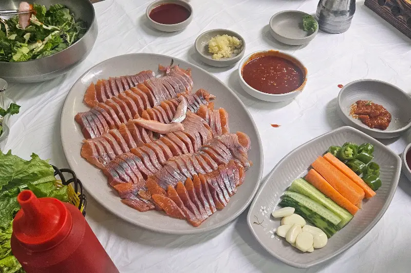 드디어 기다리고 기다리던 송어회가 등장했다. 쟁반 위에 붉은 빛깔을 뽐내며 가지런히 놓인 송어회의 자태에 감탄사가 절로 나왔다. 윤기가 좌르르 흐르는 게, 딱 봐도 신선함이 느껴지더라. 젓가락으로 한 점 집어 입에 넣으니, 쫄깃쫄깃한 식감이 정말 예술이었다. 민물고기 특유의 잡내는 전혀 없고, 담백하면서도 고소한 맛이 입안 가득 퍼지는 게, 진짜 입에서 살살 녹는다는 표현이 딱이었다.