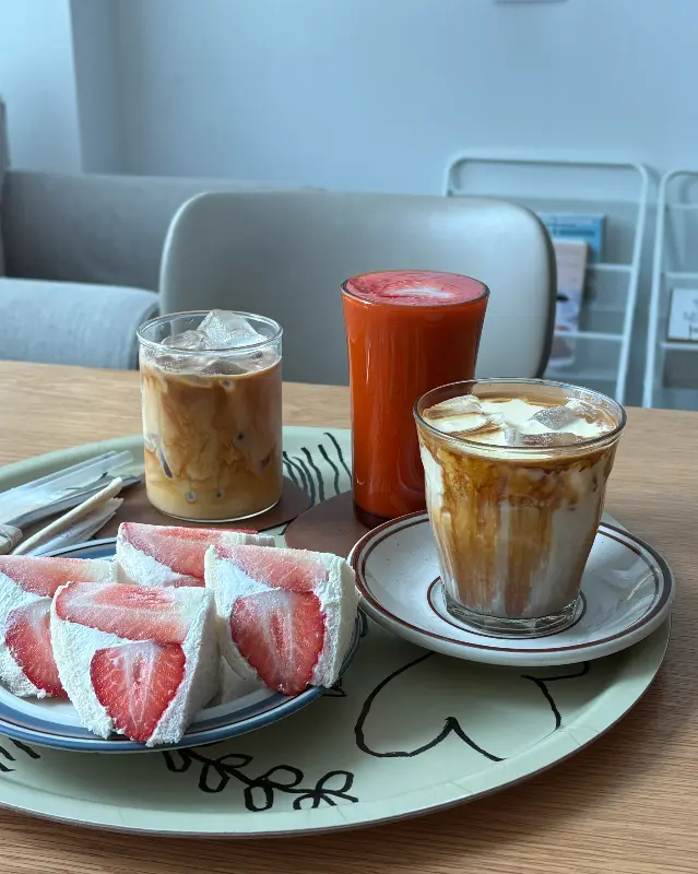 유심조에서는 다양한 종류의 커피와 음료, 그리고 이곳만의 특별한 디저트인 산도를 맛볼 수 있습니다. 저는 고민 끝에 유심조의 대표 메뉴인 유심조 라떼초당옥수수 라떼, 그리고 딸기 산도를 주문했어요.