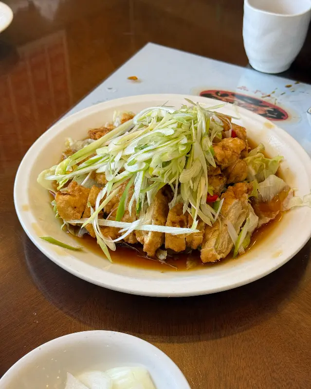드디어 숙주 탕수육이 테이블에 등장했다. 바삭하게 튀겨진 탕수육 위에 아삭한 숙주가 듬뿍 올려져 있었고, 유린기 소스와 비슷한 간장 베이스의 소스가 넉넉하게 뿌려져 있었다. 탕수육 표면에서는 160도 이상의 온도에서 일어나는 마이야르 반응의 흔적이 역력했다. 이 반응은 아미노산과 환원당이 결합하여 탕수육 특유의 갈색 크러스트와 풍미를 형성하는 핵심적인 과정이다.